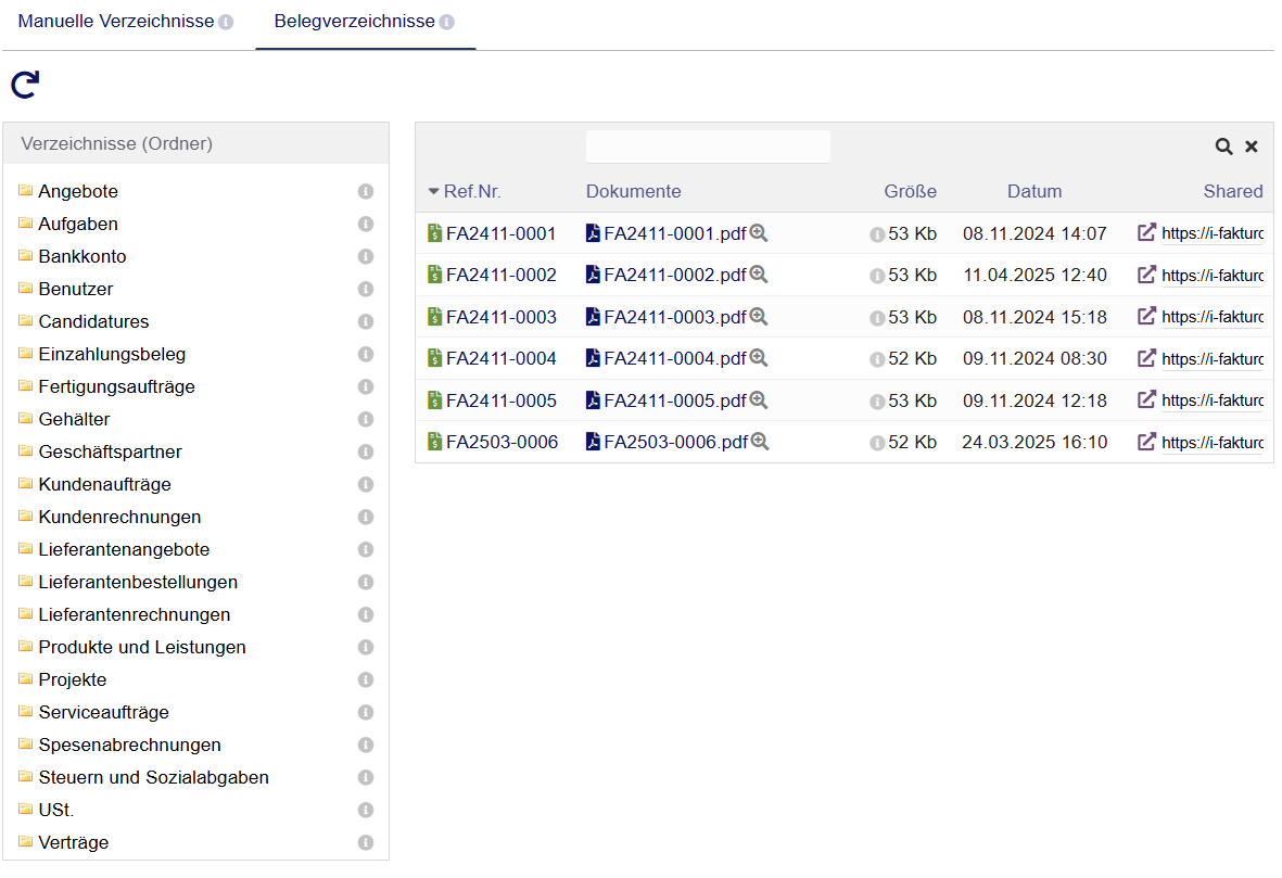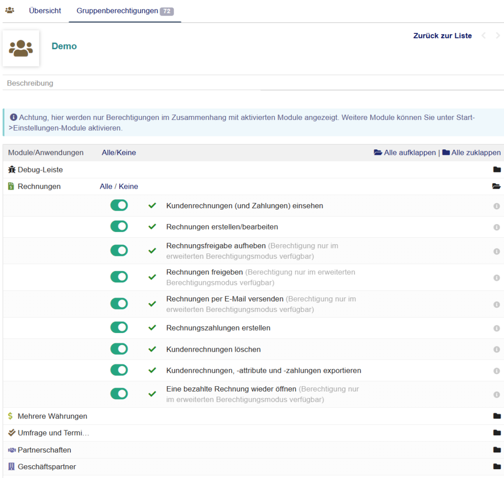 Die Funktionalitäten in i-Faktur werden im Wesentlichen durch Module gebildet. Für jedes Modul finden Sie eine Liste der Informationen und Funktionen, die in diesem Modul verfügbar sind. Aufgrund der Modularität von i-Faktur ist es jedoch möglich, dass ein Modul Informationen und Funktionen in anderen Modulen hinzufügt. Beispielsweise kann das Modul „Finanzverwaltung“ die Bankverbindung für einen Geschäftspartner hinzufügen.