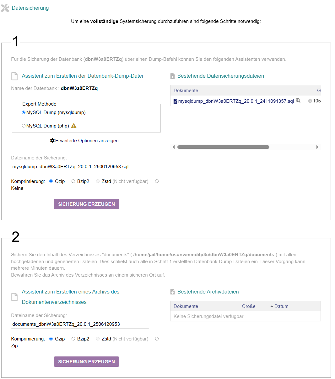 Sie können manuel eine Datensicherung der Datenbank oder eine Sicherung des gesamten Datenbestandes erstellen.