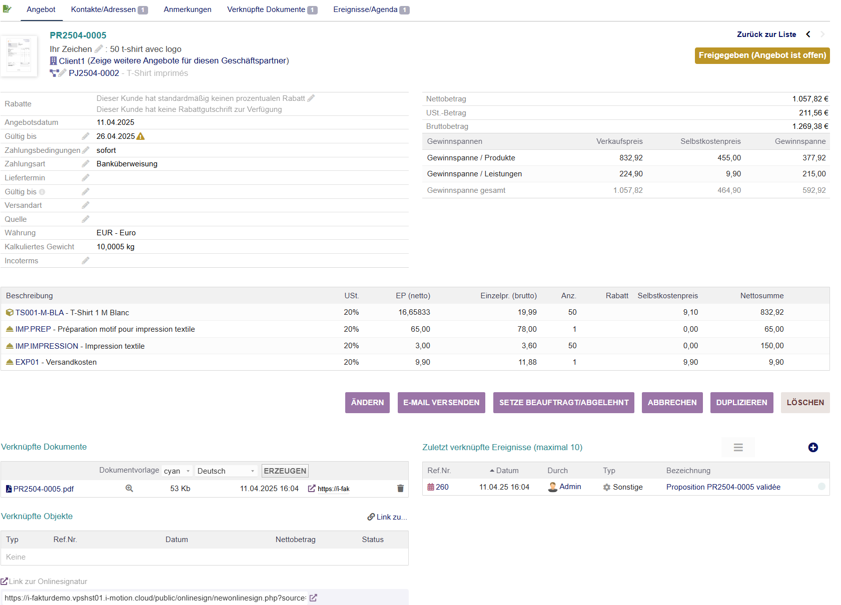 Wenn die Funktion Links zur Unterschrift aktiviert ist, wird Ihnen ein Link zur Verfügung gestellt, den Sie an den Kunden senden können, der das Angebot dann online unterschreiben kann.