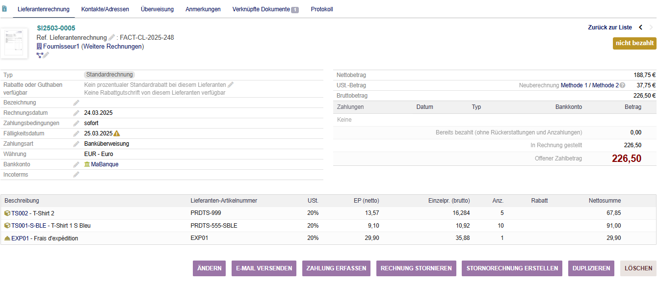 Dieses Modul ermöglicht die Verwaltung Ihrer Lieferantenrechnungen, indem es die Übereinstimmung zwischen Bestellungen und Lieferungen ermöglicht. Zudem erleichtert es die Verwaltung von Zahlungen und die Vorbereitung der Buchhaltungsunterlagen.