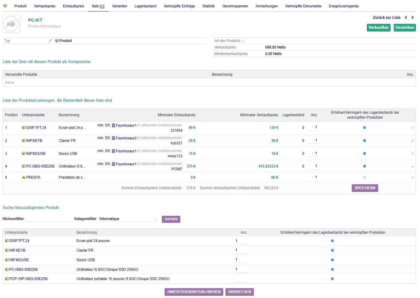 Zur Definition eines Sets suchen Sie Produkte und Dienstleistungen nach Stichwort oder Kategorie und legen für jedes enthaltene Element die Menge fest.