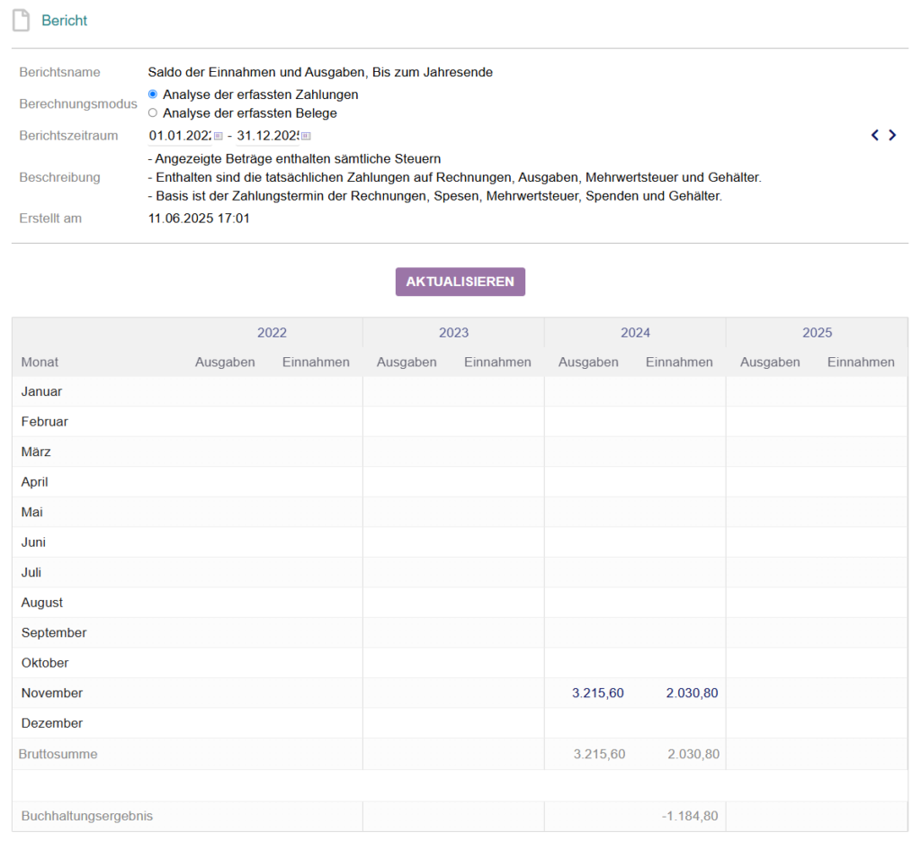 Sobald das Modul eingerichtet ist, ist keine manuelle Dateneingabe erforderlich. Die Daten werden automatisch aus Ihren Rechnungen und Ausgaben übernommen.
