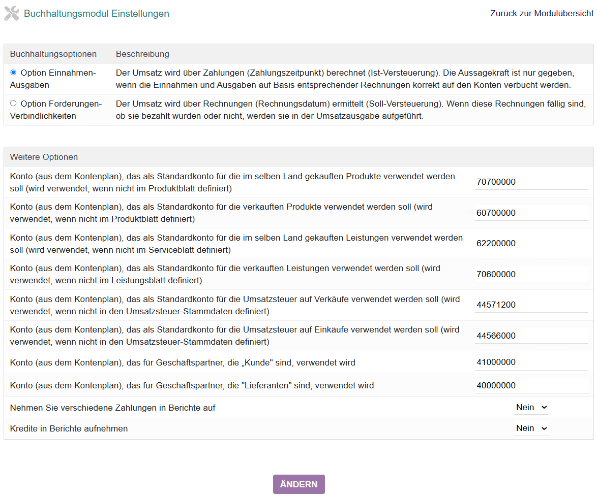 Geben Sie an, wie das Modul den Umsatz berechnen soll – entweder auf Basis der Zahlungen und Begleichungen oder auf Basis der Validierung der Rechnungen. - Standardkonten