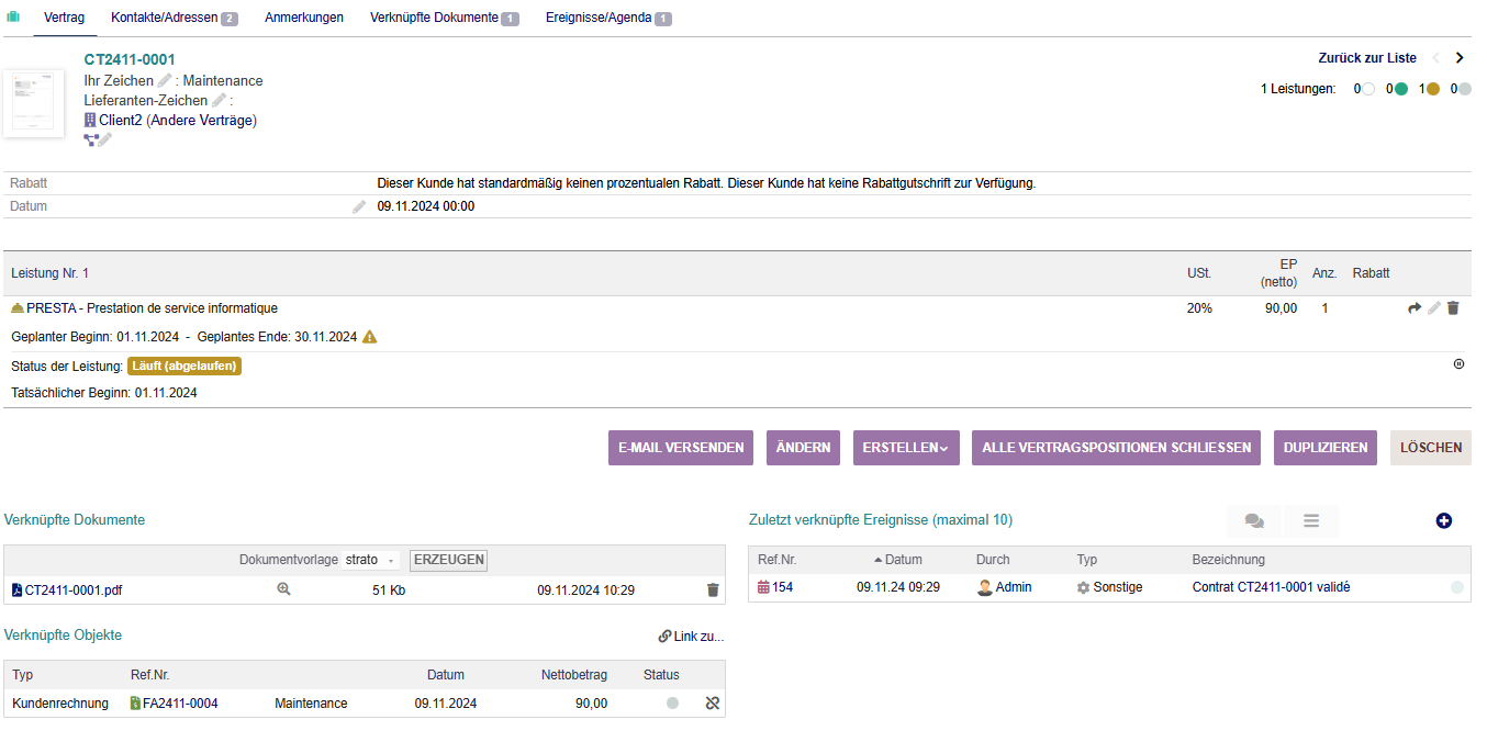 Das Modul „Vertrag“ ermöglicht Ihnen die Verwaltung von Verträgen und Abonnements mit Ihren Kunden oder Lieferanten.